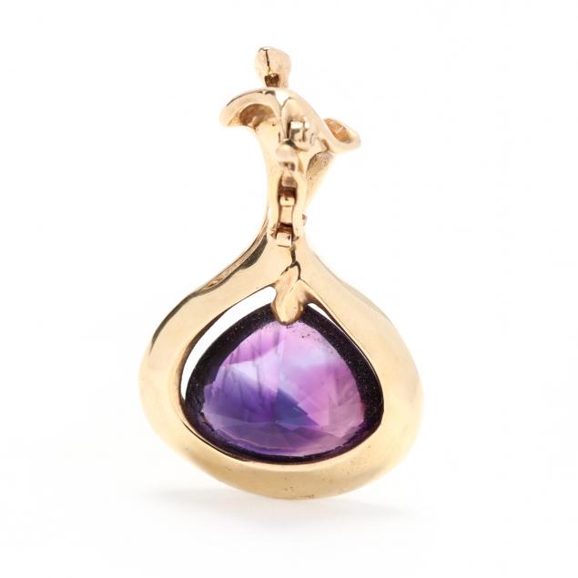 The gold setting designed as a calla lily centering on a trillion cut amethyst (17.25 x 15.2 x 10.65 mm) weighing approximately 11.80 carats and with an oval cut diamond accent set to the flower, completed with a hinged bail and figure eight safety catch, testing 14KT.