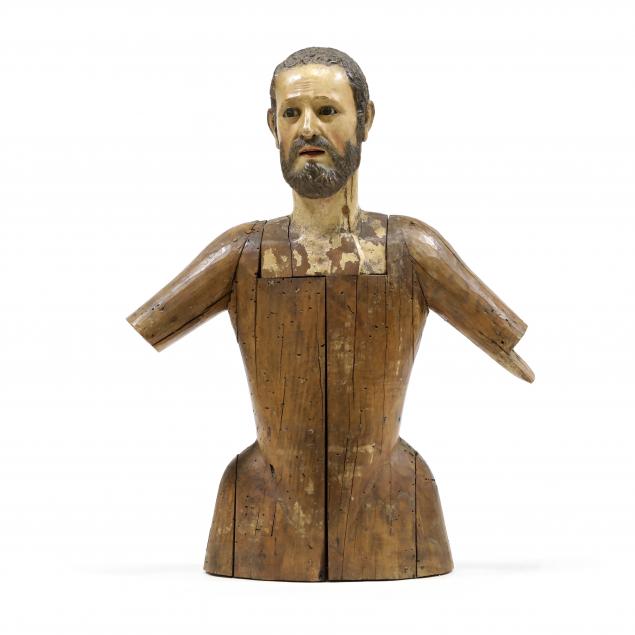 Circa 1800, possibly Spanish or Italian, carved and painted wood, depicting a well rendered naturalistic bearded male figure with wide eyed expression and open mouth, the figure would have been clothed and exhibited within the church during religious holidays/events, appears unmarked.