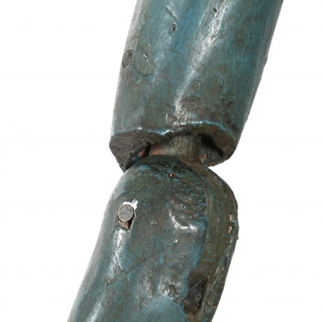 Circa 1800, possibly Spanish or Italian, carved wood, gesso and polychrome with glass eyes, articulating elbows and knees, depicting a male saint figure with blue-painted undergarments. These figures would be clothed and displayed within the church during religious holidays and events.