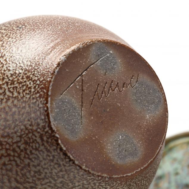 Stoneware, the first is a turned and molded carved vase, high gloss glaze, signed on the underside "Lynn Roe" (11 3/4 in.); the remaining three are salt glazed with illegible signatures (tallest 11 1/2 in.).