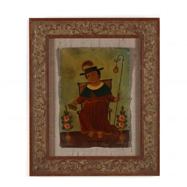 19th century; the first inscribed "Na. Sd. del Patrocinio de Tarata en 1864," Bolivian, oil on tin, framed (Frame dimensions 11 1/2 x 10 in.); the second depicting "El Niño de Atocha," Mexican, oil on tin, framed (Frame dimensions 15 3/4 x 13 in.).