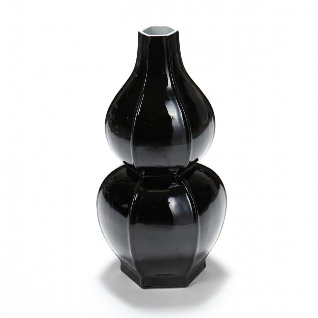 Glossy black glaze, double gourd form in hexagonal panels, conforming base and tapered oculus, appears unmarked.