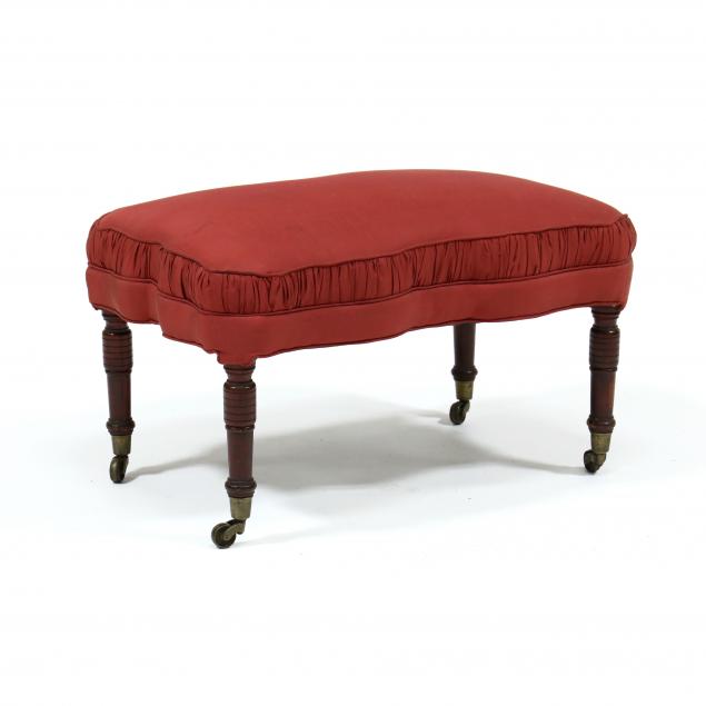 Late 19th century, rectangular form with shaped serpentine edges, pleated over upholstery, raised on four turned legs on brass casters.
