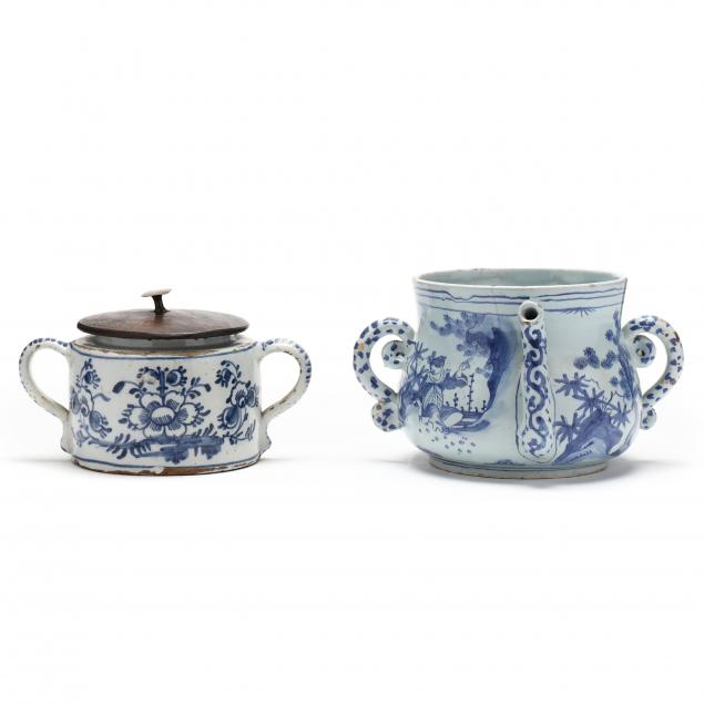 18th century, double handled forms, the first is English posset pot with chinoiserie decoration, scrolled handles and single spout 5 7/8 in.) (interior bottom hairline not through; rim hairlines; scattered chips) underside marked "6"; the second is a probably Lambeth butter tub with later wood cover (5 1/2 in.) (glaze scrapes at both rims and shoulder) not signed.