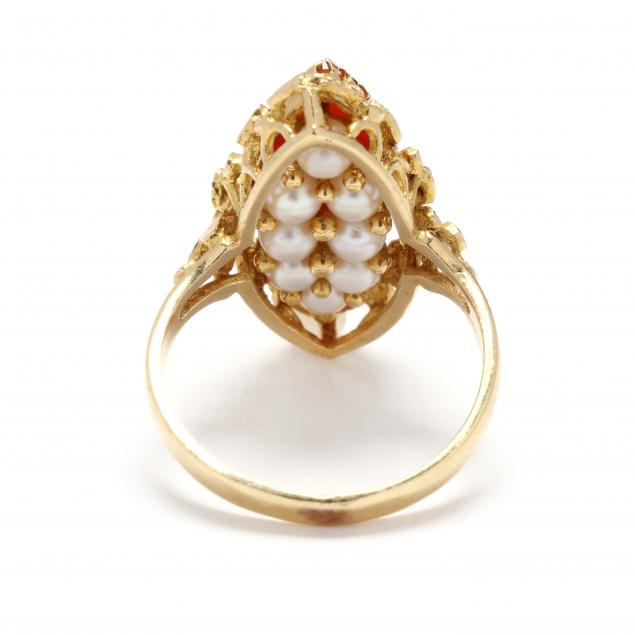The navette shape gold mount with textured detailing and with central hinged element, one side set with a cabochon coral and the other with round cultured pearls, stamped 750 Spain.