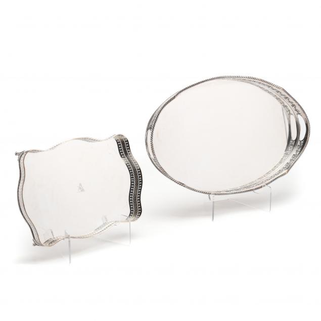 Early 20th century, each with reticulated gallery, the smaller of serpentine form, mark of William Adams Inc., Birmingham and New York. electroplated on copper, pattern number 1014, raised on stylized foliate feet, center with engraved figural motif (2 x 9 1/2 x 13 1/2 in.); the second of elliptical form with open oval handles, having floral garland motif between gadrooned rim borders, marked "Made In / Sheffield / England" to underside, raised on turned feet (2 3/4 x 19 1/2 x 13 in.