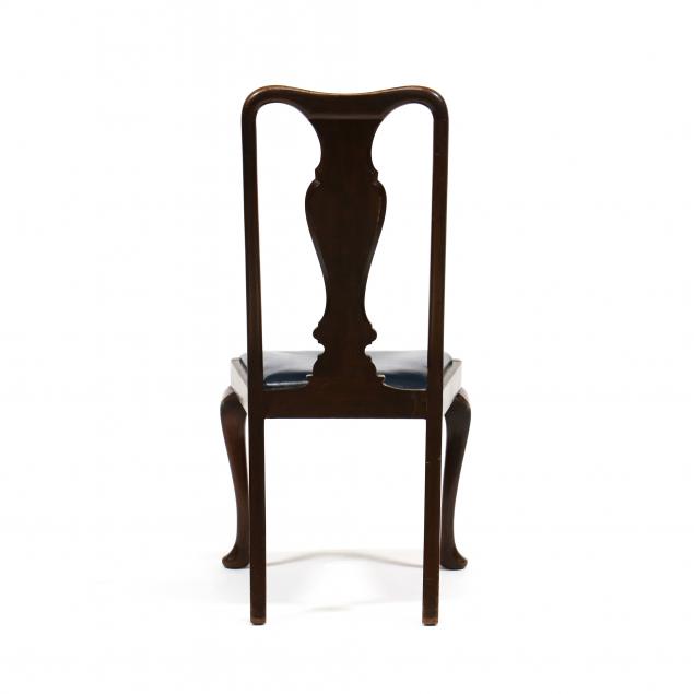 Early 20th century, all side chair form, shaped crest rail, vasiform back splat, blue naugahyde upholstered slip seats, front cabriole legs with pad foot.