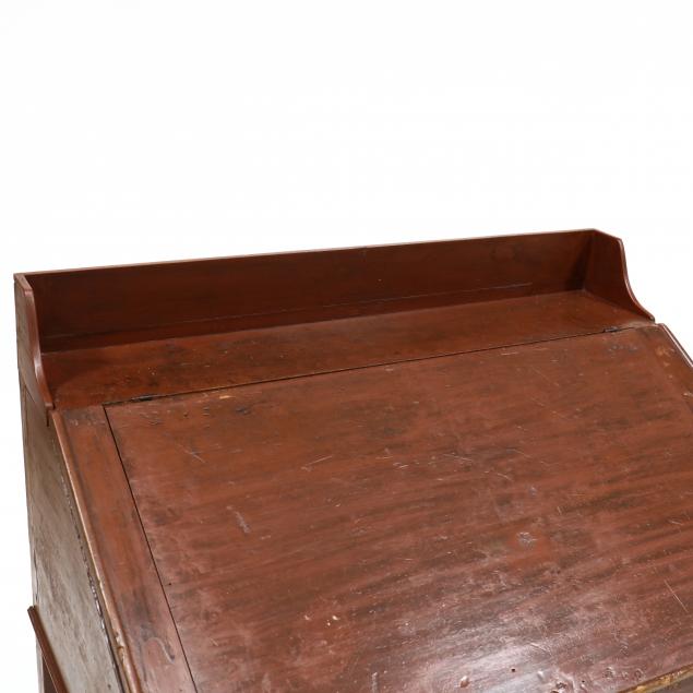 19th century, one piece form, white pine with red wash, dovetailed back-splash, hinged slant front lid with breadboard ends, interior with two drawers and later Dupont Dynamite advertising, applied molded edge, raised on tall square tapered legs.