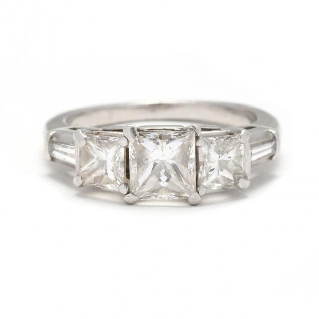 Prong set to the center with a princess cut diamond (5.82 x 5.5 x 4.0 mm) weighing approximately 1.02 carats (G color, SI1 clarity) and accented to each side with a princess cut diamond weighing approximately .50 carat each (G-H color, SI1 clarity) and (G-H color, I2 clarity), stamped platinum.