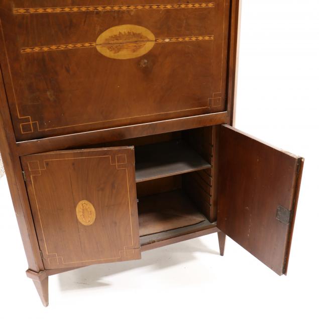 From the Collection of the late Betty Smallwood, Charlottesville, VA Scratches and wear to top; felt writing surface needs replaced; lock replaced and with cut/patch; escutcheon hole with wear; lid and lower panel doors with shrinkage cracks; general wear at corners and edges.
