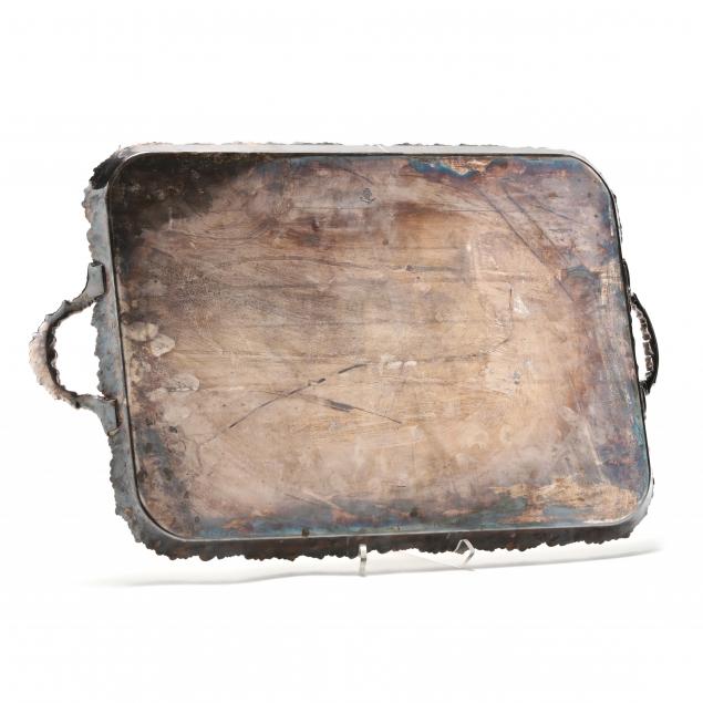 Early 20th century, heavy cast rectangular tray with double handles, Rococo style foliate border with chased scrollwork, marked.