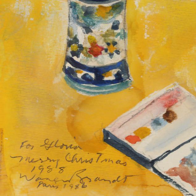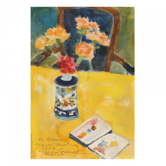 Watercolor on paper, inscribed and signed at lower left "For Gloria / Merry Christmas / 1958 / Warren Brandt / Paris 1956," matted and framed under glass.