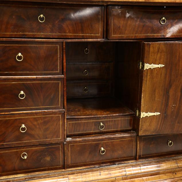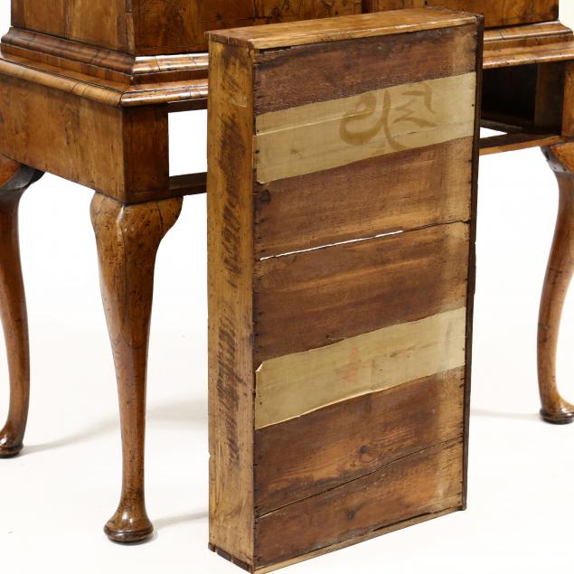 Early 18th century, burl walnut veneers, pine secondary, two part form, dovetailed case, applied cornice with vertical veneer, convex frieze with secret drawer, two hinged cabinet doors with triple line light/dark wood inlays, book-matched veneers to interior and exterior of door, interior with central door and featuring a total of (13) small drawers, the stand with single long drawer, raised on tall cabriole legs with pad foot.
