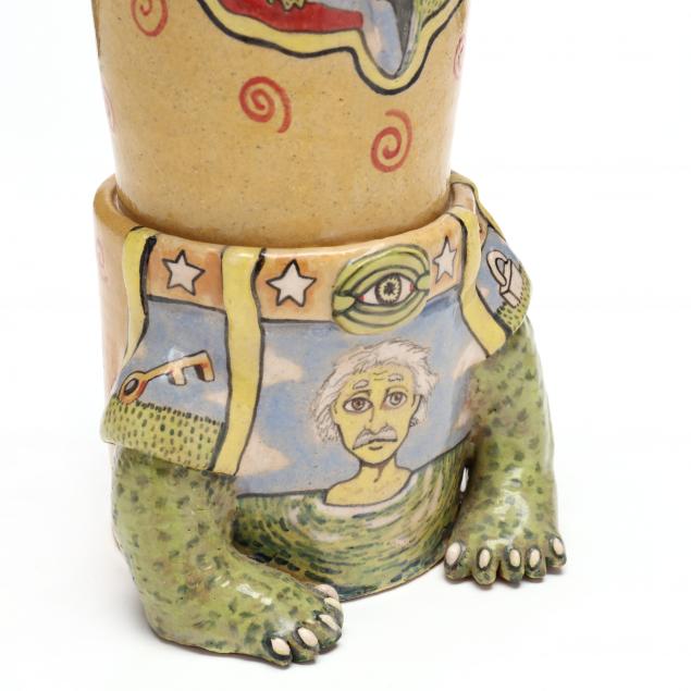 An upright molded and turned figure of an alligator in Western style garb including ten-gallon hat, polychrome decorated with vignettes, text on the verso, signed and dated on the underside.