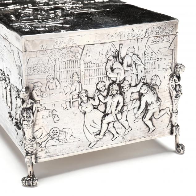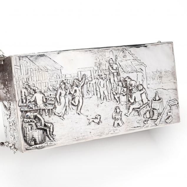 Pseudo hallmarks for B. Neresheimer & Sohne to underside, the interior rim with English import marks for John George Smith of London (1898), rectangular form featuring caryatids to each corner and raised on scrolled feet, each side decorated with figural tavern scenes in the style of Teniers and other Dutch masters, with original locking mechanism but lacking key.