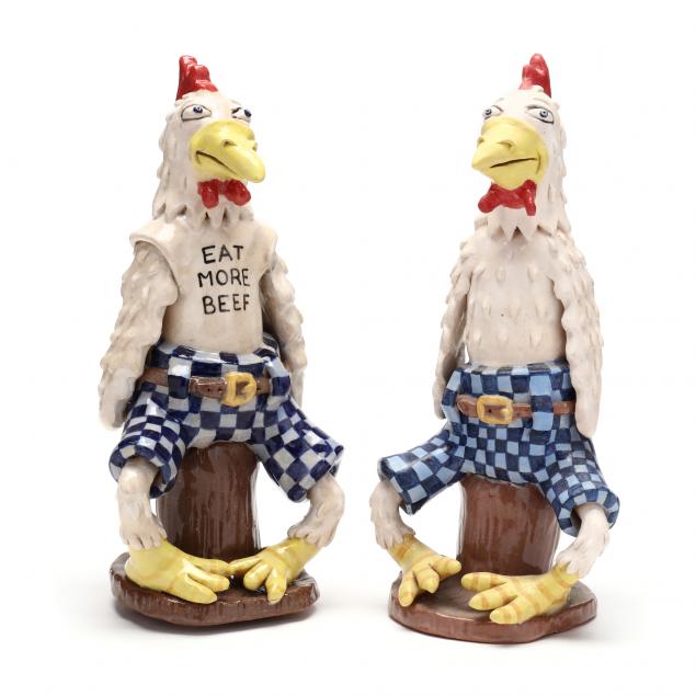 Circa 2010, one chicken boasts a sleeveless shirt reading "Eat More Beef," each with checkered shorts sitting on a log, signed and dated to the undersides.