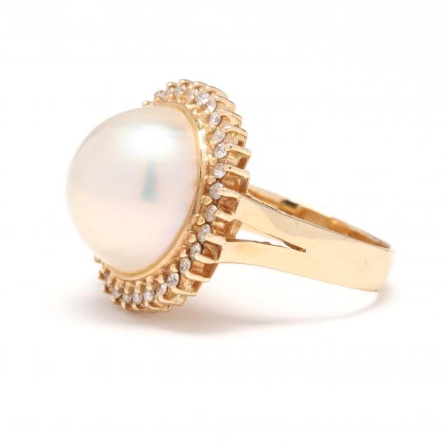 Centered on a mabé pearl (13.7mm) bezel set within a halo of full cut round diamond melee weighing approximately .32 total carat (G-H color, I1-I2 clarity), stamped 585 14K.