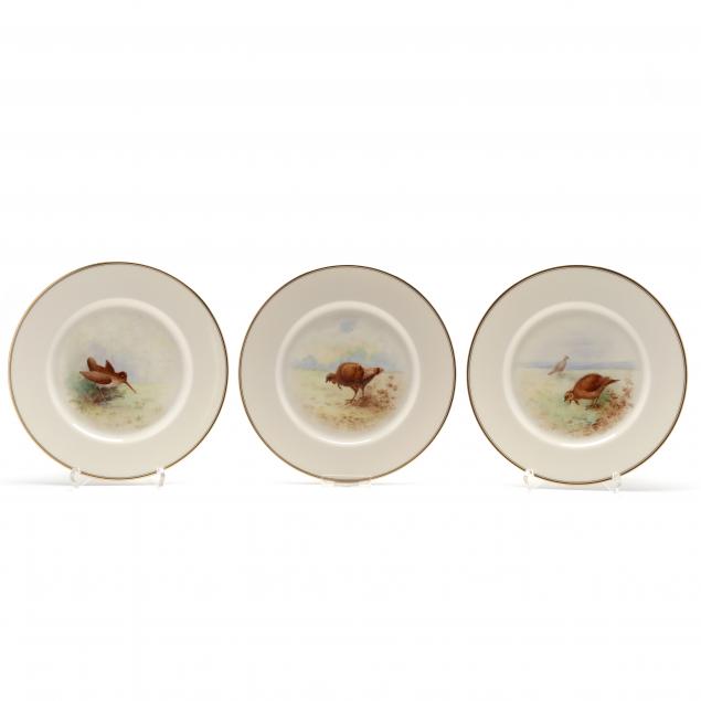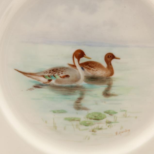 20th century, each painted with a different game bird against a white field within a gold rim, retailed by Marshall Fields, Chicago, marked to underside of each.