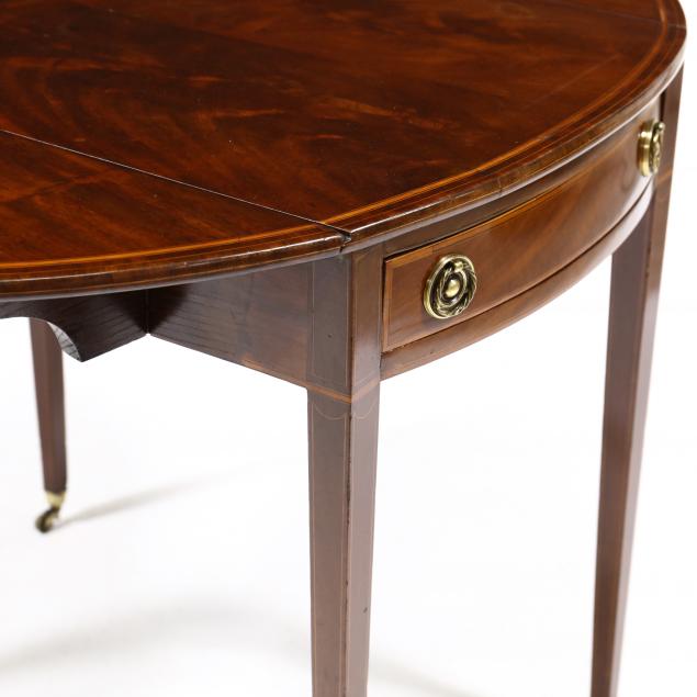 Circa 1800, mixed wood secondary, top with book-matched mahogany veneers, demilune drop leaves with double-butterfly support, single bow-front drawer, tall square tapered legs on casters, light wood line inlays throughout.