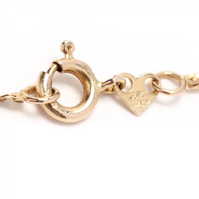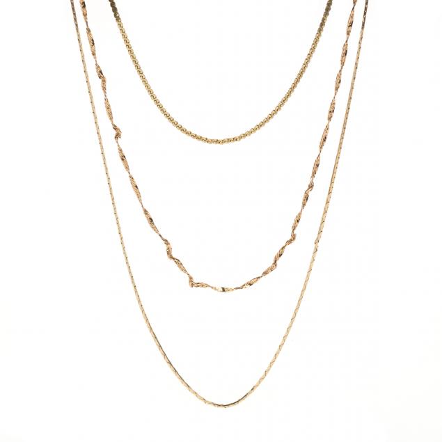 To include: a cobra chain completed with a spring ring clasp, stamped Italy 14K (.75mm x 20 in.); a serpentine chain completed with a spring ring clasp, stamped 585 Italy 14K (1.4mm x 15 in.); and a Singapore chain completed with a spring ring clasp, stamped 14KT OR (17.5 in.) (with some kinks).