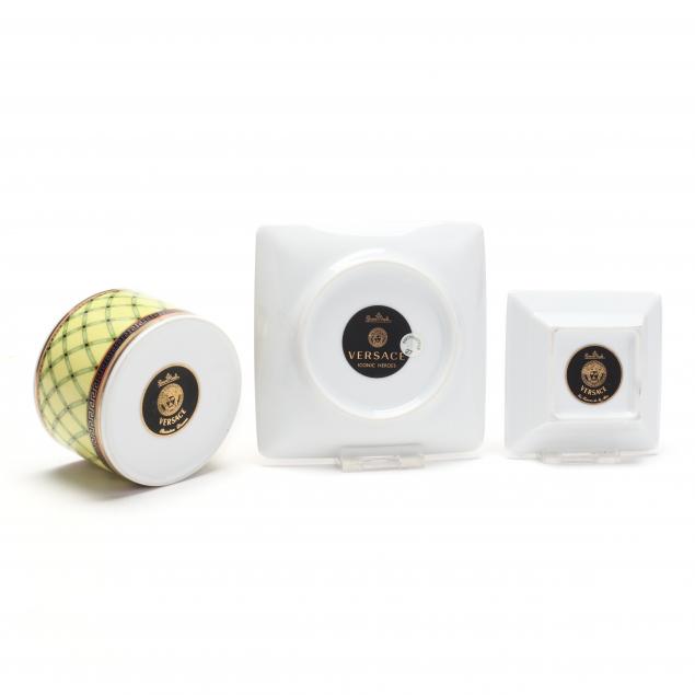 Five porcelains by Rosenthal, the largest a compote (6 x 7 1/2 x 7 1/2 in.), the second is a dish centered with a bisque gorgon (6 7/8 x 6 7/8 in.); two small dishes and a trinket box, all with Versace boxes; the 5th item is a octagonal crystal bowl alternating panels decorated with a gorgon (3 1/2 x 6 7/8 x 6 7/8 in.)
