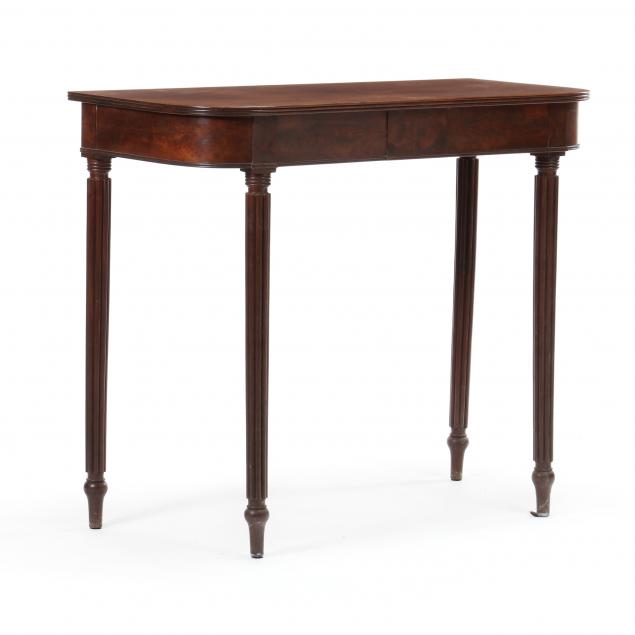 Attributed to Richmond, Virginia, circa 1820, mahogany veneer, poplar secondary, solid one board 'D-end' top with reeded edge, conforming burl book-matched veneered skirt with central raised panel, base of skirt with applied reeded molding, raised on tall ring turned reeded and tapered legs.