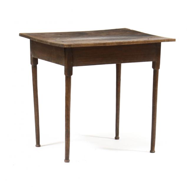 18th century, attributed to Chowan County, North Carolina, rectangular two board top, flush skirt rails, wood peg joinery, straight rounded legs with button feet.