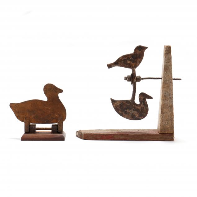 Circa 1920, painted iron bird targets mounted to wood.