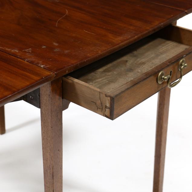 Probably Virginia, circa 1800, yellow pine secondary, rectangular top and drop leaves with double butterfly support, single thin drawer with dark wood edge inlay, square tapered legs with inside chamfer.