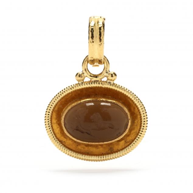 The oval Venetian glass intaglio cabochon carved to depict a stalking lion and gazelle bezel set within a hammered gold frame and with mother-of-pearl support, suspended from a hinged bail stamped 19K and with maker's mark.