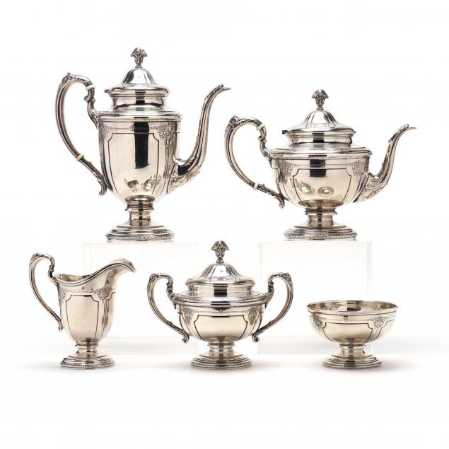 Five piece set, all pattern number 76160, including a coffee pot (11 in.); teapot (8 1/2 in.); covered sugar (7 in.); creamer (5 7/8 in.); wastebowl (3 1/8 in.). All without monograms.