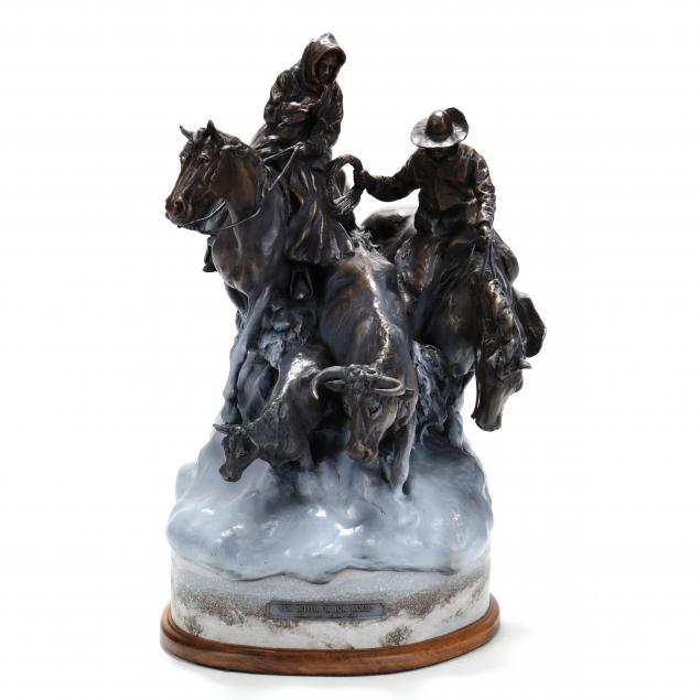 Patinated cast bronze, cast as a couple on horseback flanking a bull and calf on a snowscape form plinth, incised signature and date to side, numbered edition 5/10, with Hoka Hey Fine Arts foundry mark to verso, upon a conforming base with painted continuous scenic Western landscape and gallery plaque.