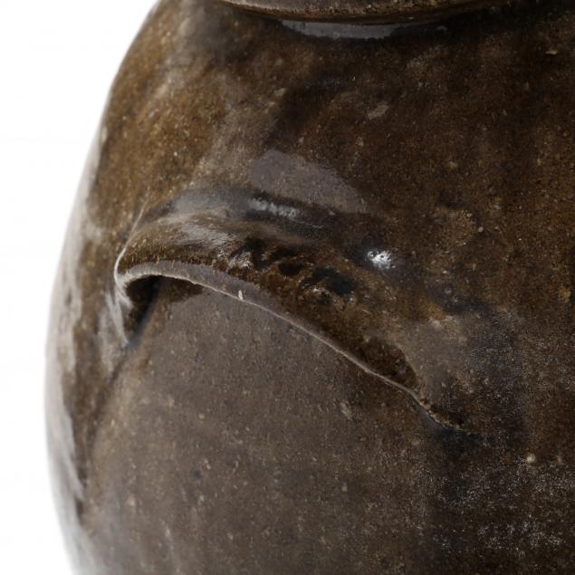 Alkaline glazed stoneware, highly ovoid form with flattened rim and small ear handles, streaky olive glaze showing numerous small quartz fragments, one handle clearly stamped "NB", script marked capacity "6" to the right.