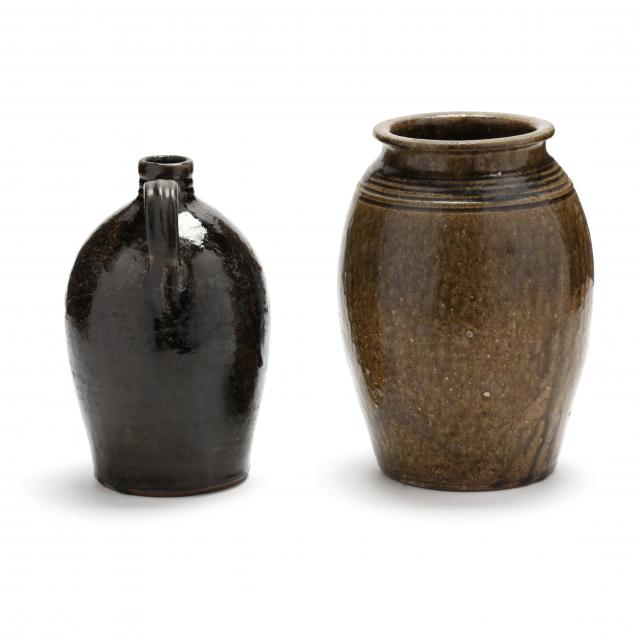 Alkaline glazed stoneware, the first is a jar with light olive glaze, five turned bands at the upper shoulder, clear stamp below the bands, "DS / 1"; the second, a jug, has an Albany slip glaze with stamp "DS 1/2 ".