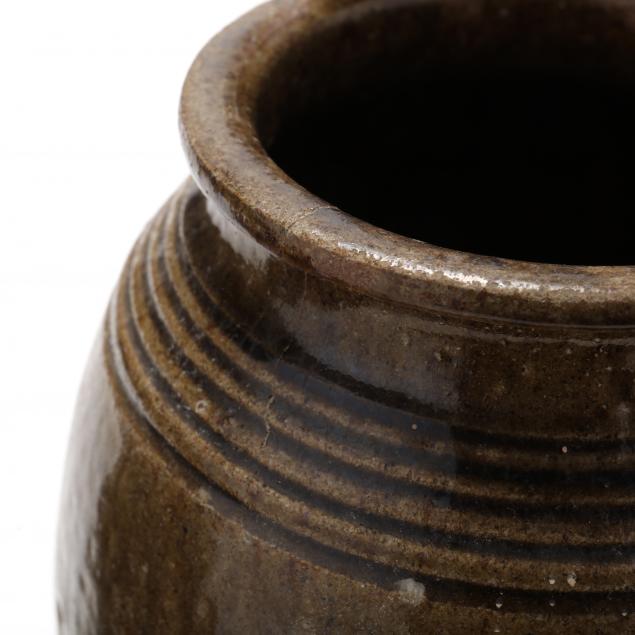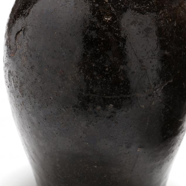 Private Collection, Concord, North Carolina Jar has several hairlines that extend the length of the pot with interior stabilizing tape and patch. Jug has been broken in several parts and glued.