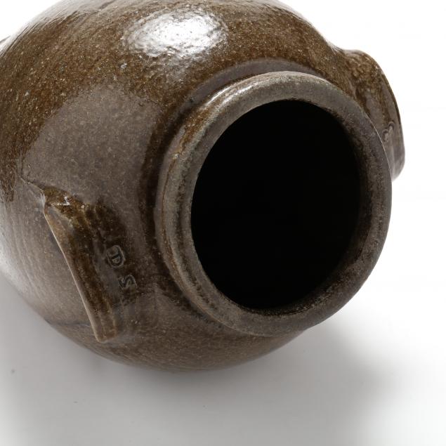 Alkaline glazed stoneware of a light olive hue, tall semi-ovoid form with a rim which overlaps a short recessed neck, one ear handle stamped "DS" the other stamped "3".