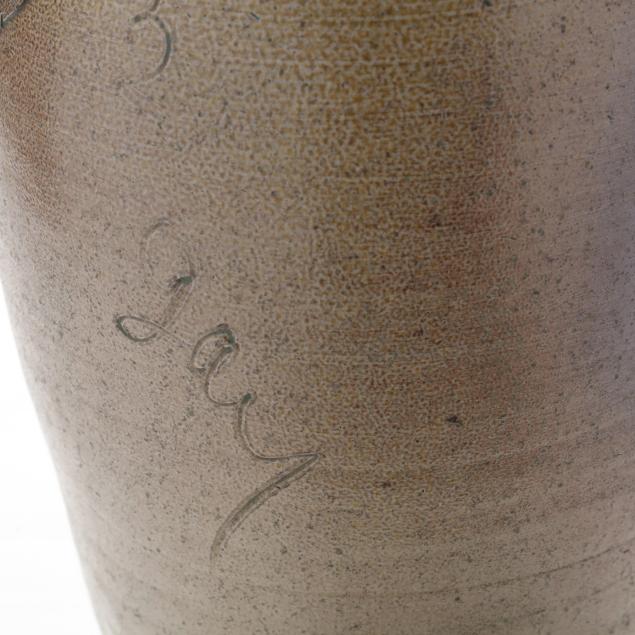 Salt glazed stoneware, having a high collar with inner rim, applied ear handles, straight tapered sides, signed in script on the diagonal "Gay".