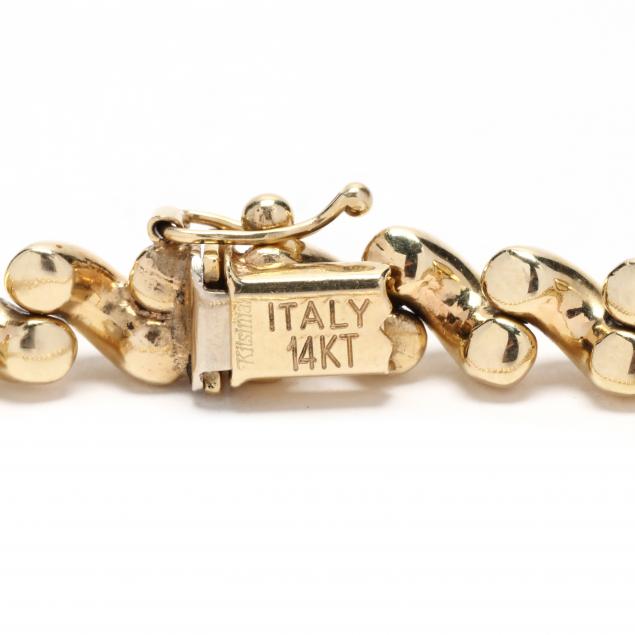 In the San Marco design completed with an integrated clasp with safety catch, stamped 14KT Italy and with maker's mark Kitsinian.
