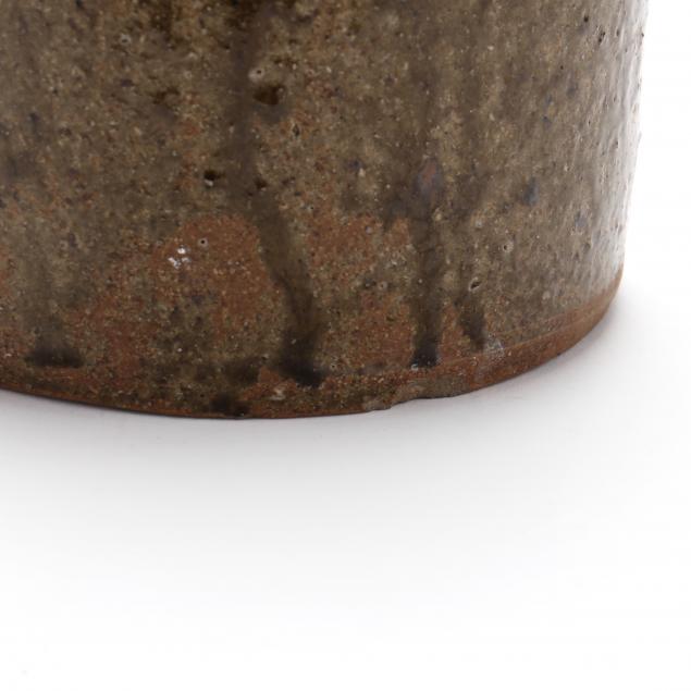 Alkaline glazed stoneware, cylinder form with high collar and inner rim, heavily marked with dark streaks, stamped "LSR / Blackburn NC ".