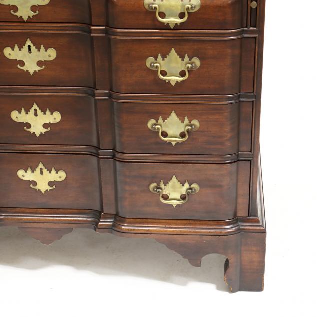 Early 20th century by Colonial Furniture, solid mahogany construction, molded edge slant lid, divided and drawered interior with column form document drawers, the case with four graduated "block-front" drawers, side with batwing bail handles, shaped bracket feet, labeled.
