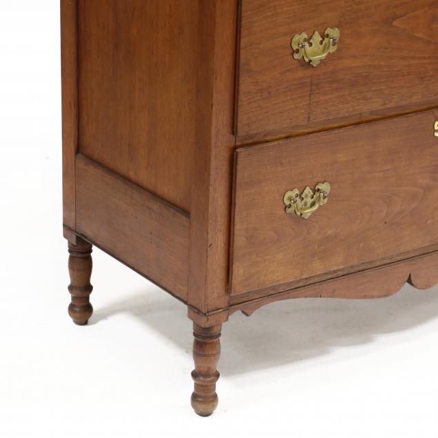Attributed to Virginia, circa 1830-40, poplar secondary, rectangular top, three upper side-by-side drawers (the right/left drawers with underside wood latch locking mechanism), over three graduated drawers, all lipped, scalloped skirt, paneled sides, turned feet.
