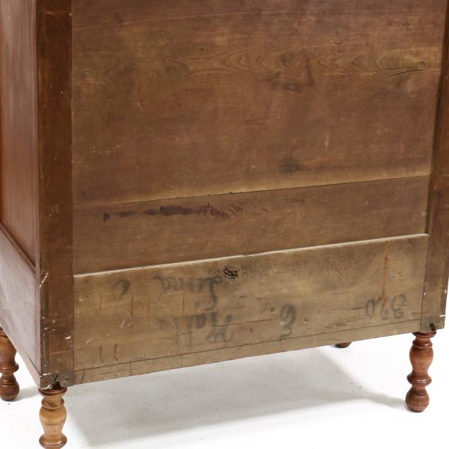 Circa 1820, poplar secondary, rectangular top with applied slightly rounded edge, two small drawers over a deep long drawer over three recessed graduated drawers all with solid tiger maple fronts, fully turned stiles, paneled sides, turned feet.