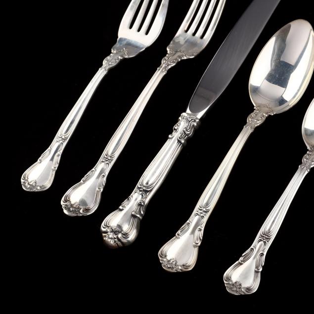 (45) pieces, service for eight, including: (8) knives (9 1/4 in.); (7) forks (7 1/2 in.); (1) fork (7 in.); (8) salad forks (6 3/8 in.); (8) oval soup spoons (6 3/8 in.); (8) teaspoons; (2) pierced tablespoons; serving fork; gravy ladle; and lemon fork. No monograms.