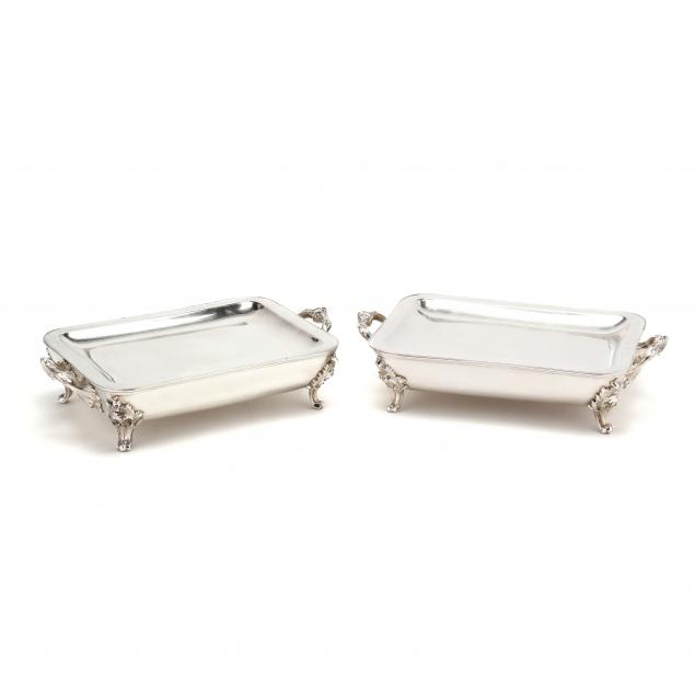 Early 19th century, rectangular form with foliate double handles and down-swept foliate legs, both with removable conforming tray, without covers. Unmarked and without monograms.