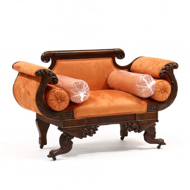 Circa 1830, possibly Massachusetts, mahogany, rosewood and mahogany veneer, rolled crest rail featuring scrolled carved rosettes, shaped cornucopia arms, seat rail with inset panel flanked by two raised panels with brass inlaid trim, raised cornucopia paw front feet, on casters.