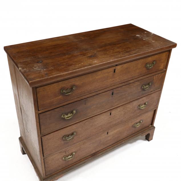 Probably Virginia, early 19th century, yellow pine secondary, later rectangular top, four graduated drawers with scratch bead, shaped bracket feet.
