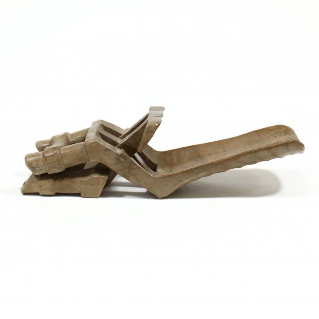 20th century, carved hardwood, the hinge located at the seat allowing the chair to be folded, stylized stretcher leg base.