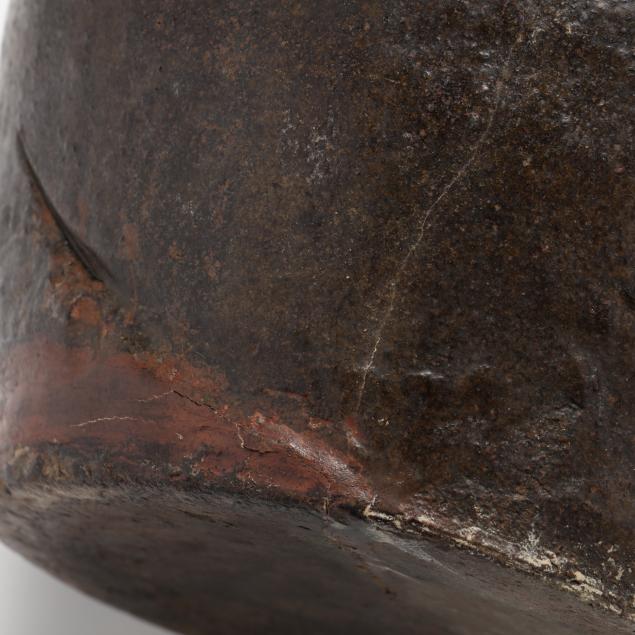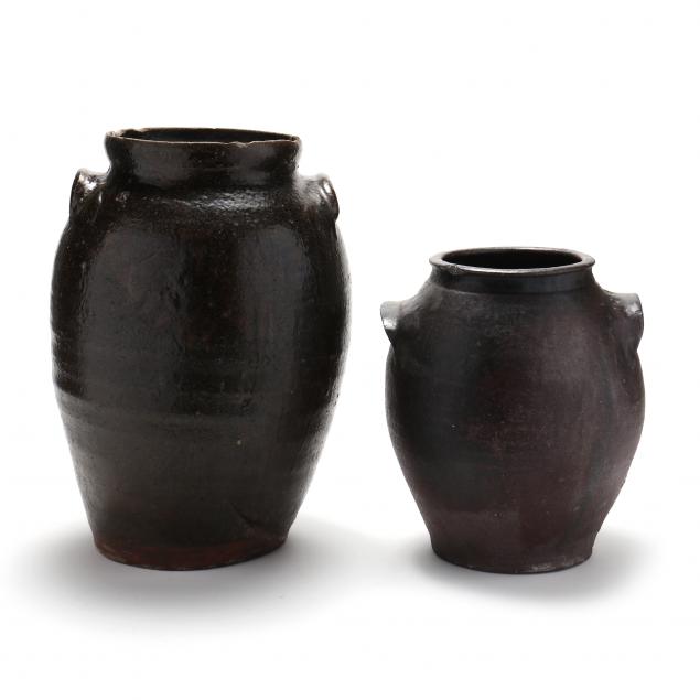 Alkaline glazed stoneware, the first is stamped "JM 2' on one handle (11 1/2 in.) (broken and repaired with fill; rim chips and hairlines across the underside; over-fired); the second is stamped "JS" with a hand inscribed "5" (rim chips; area of base broken and repaired; hairline across base; other small defects) ( 16 in.).