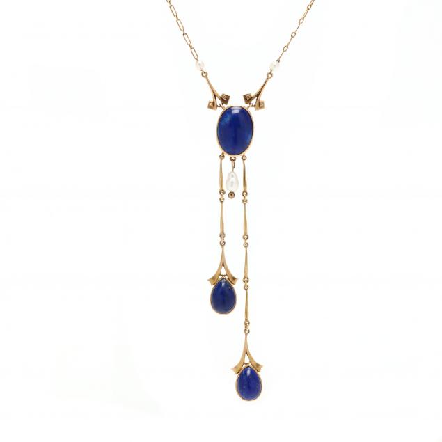 Pendant bezel set with an oval cabochon lapis (13.48 x 9.63 mm) and with two bezel set pear cabochon lapis suspended from bar links and with a freshwater pearl drop, joined to a fine paperclip link chain with two pearl stations, testing 14KT.