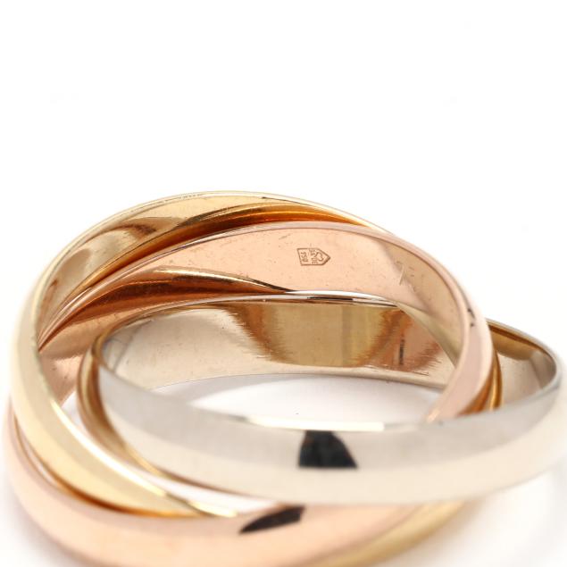 Designed as three entwined bands in yellow, white, and rose gold, engraved